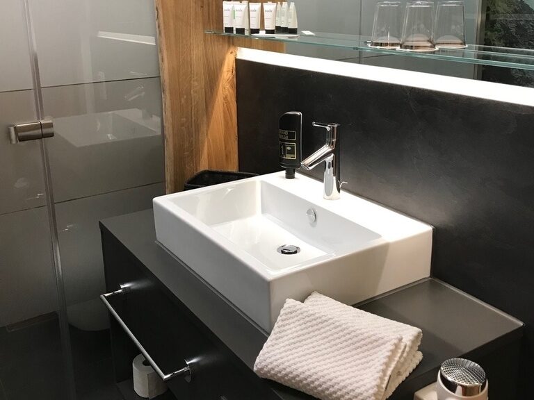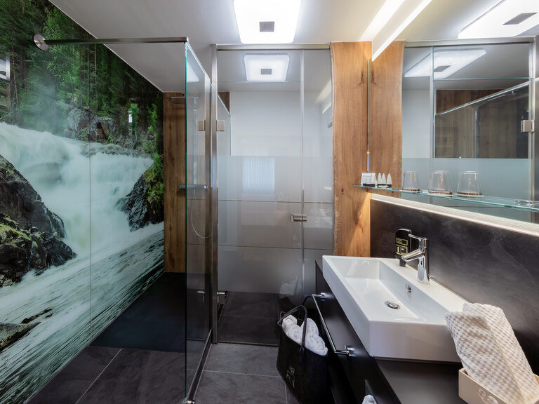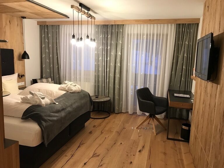 Komfortables, neu gestaltetes Doppelzimmer mit Wohnecke und Vorraum mit Garderobe und Schrank, Eichenholz, Holzboden Schreibtisch, Flach TV, Durchwahltelefon, Minibar, Radio, offenes Bad mit Naturkulisse, Dusche, abgetrenntes WC, Fön, Balkon, Leihbademantel mit Schlappen, Badetasche mit Saunatücher